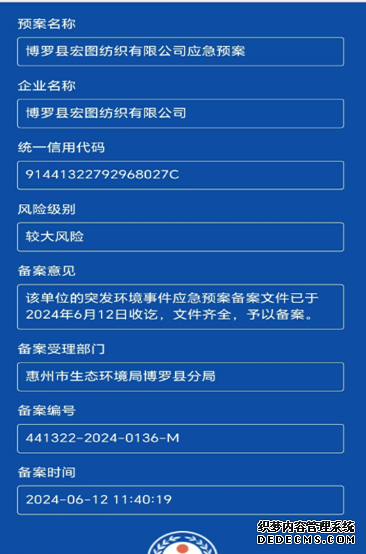 已制訂《博羅縣宏圖紡織有限公司環(huán)境風(fēng)險(xiǎn)評(píng)估報(bào)告》,并于2017年10月25日上報(bào)博羅縣環(huán)境保護(hù)局備案; 2021年和2024年在惠州市生態(tài)環(huán)境局博羅分局進(jìn)行再次備案 |