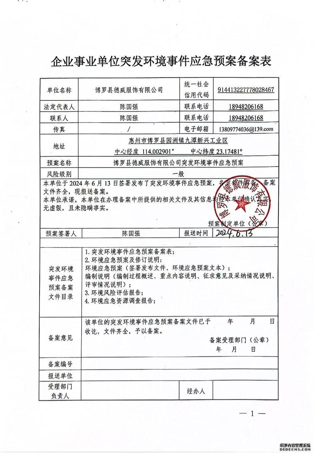 附件鏈接:《博羅縣德威服飾有限公司突發(fā)環(huán)境事件應(yīng)急預(yù)案備案登記表》 |