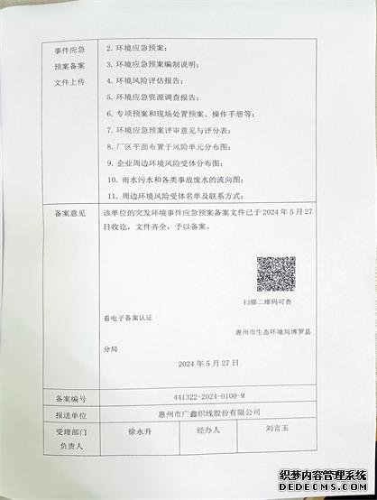 | 應急預案備案函 | 惠州市廣鑫織線股份有限公司突發(fā)環(huán)境事件應急預案 | 惠州市生態(tài)環(huán)境局博羅分局 | 441322-2024-0100-M | 需要者依申請?zhí)峁⿸呙杓?/span> |